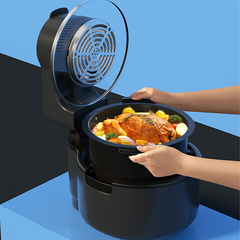 Этот воздушный фритюрник имеет 5 -литровый способность, что делает его хорошим для семейных блюд или вечеринок. Его прозрачная стеклянная верхняя вершина позволяет отслеживать процесс приготовления, в то время как встроенный кольцевой свет обеспечивает равномерное отопление. Система циркуляции мощности и горячего воздуха 1200 Вт обеспечивает хрустящие результаты с меньшим маслом. Несоответствующее покрытие и простой в очистке делают его удобной и здоровой альтернативой традиционным методам жарки.